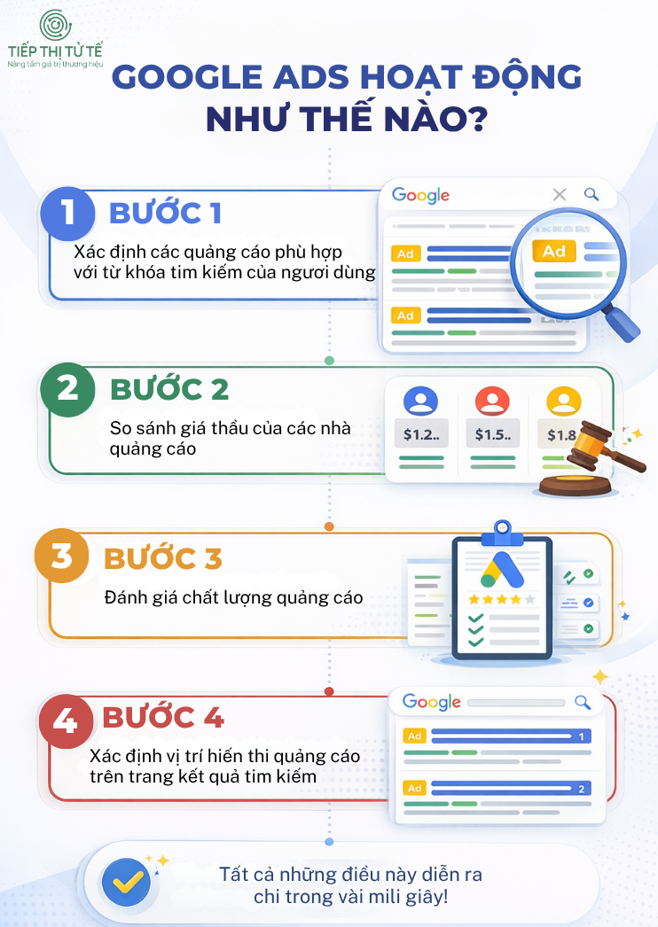 Google Ads hoạt động dựa trên một hệ thống gọi là đấu giá quảng cáo (Ad Auction). Mỗi khi người dùng thực hiện một tìm kiếm trên Google hoặc truy cập một website trong mạng hiển thị, hệ thống Google sẽ tiến hành một phiên đấu giá quảng cáo để quyết định quảng cáo nào sẽ được hiển thị.